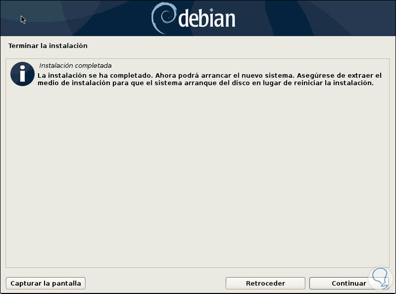 Pulsamos en Continuar y así hemos finalizado la instalación de Debian 10: