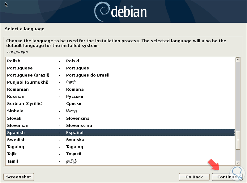 En este caso seleccionamos Install y en la próxima ventana definiremos el idioma de instalación de Debian 10: