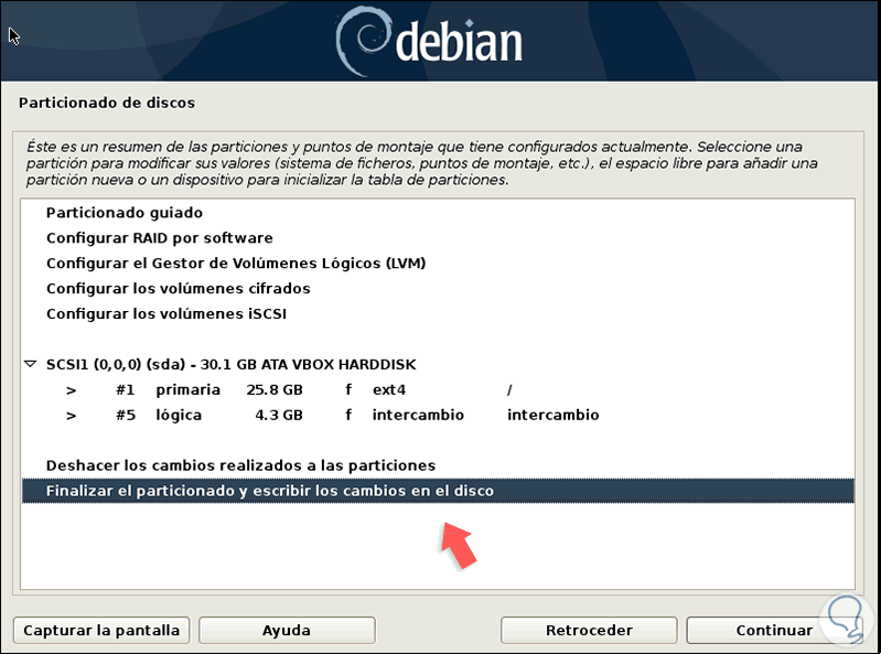 Una vez definida damos Enter y veremos la estructura de cómo se montará el disco seleccionado. Si estamos de acuerdo seleccionamos la opción “Finalizar el particionado y escribir los cambios en el disco”.