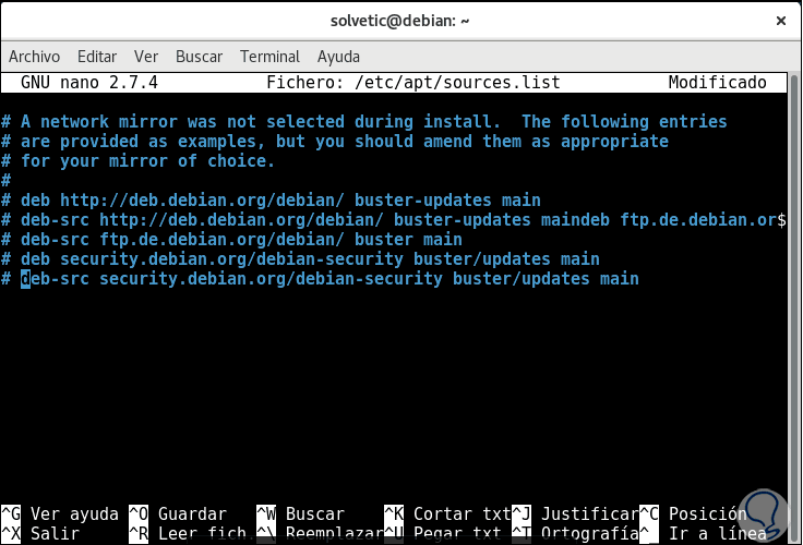 Luego de esto, accederemos a la ruta /etc/apt/sources.list y allí ingresaremos las siguientes líneas las cuales redireccionan a los repositorios de Debian 10: