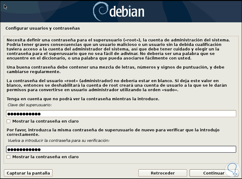 Pulsamos en Continuar y asignaremos la clave del usuario root: