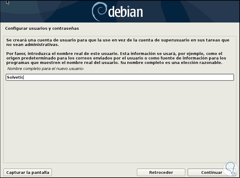 Damos clic en Continuar y vamos a definir el nombre del usuario: