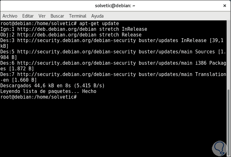Allí debemos esperar que el proceso se encargue de descargar e instalar los paquetes necesarios, luego de esto el sistema será reiniciado y podremos disfrutar de las nuevas funciones de Debian 10.