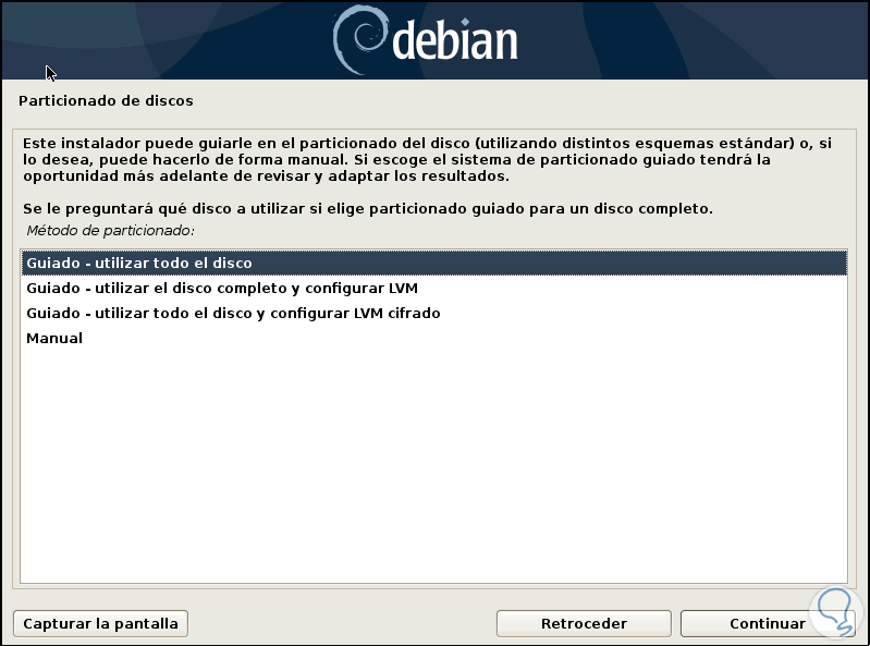 Cuando este finalice tendremos la opción de usar el método guiado con opciones como añadir la seguridad LVM (Gestión de volúmenes lógicos) o cifrar el disco, también es posible seleccionar la opción Manual para crear nuestras propias particiones según sea la necesidad del entorno: