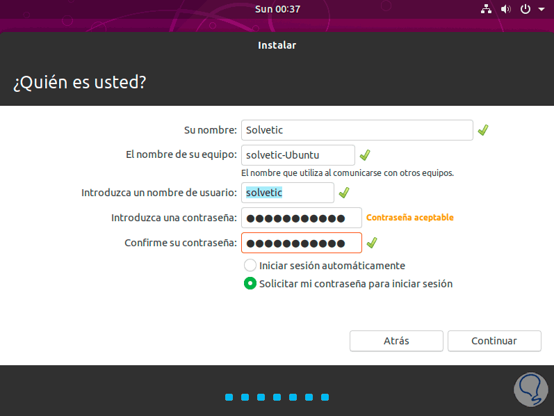 Este método aplica para las contraseñas tanto de inicio de sesión como de ejecución de comandos, pero podemos desde el momento de la instalación del sistema evitar que el usuario ingrese con una contraseña, para esto, seguimos con Ubuntu 19, en el momento de instalación en la sección de la creación del usuario activar la casilla “Iniciar sesión automáticamente”. Esto evitaré el ingreso de la contraseña.