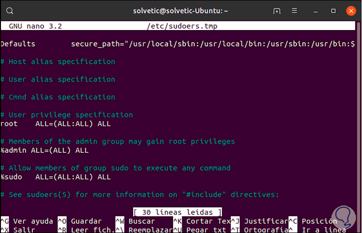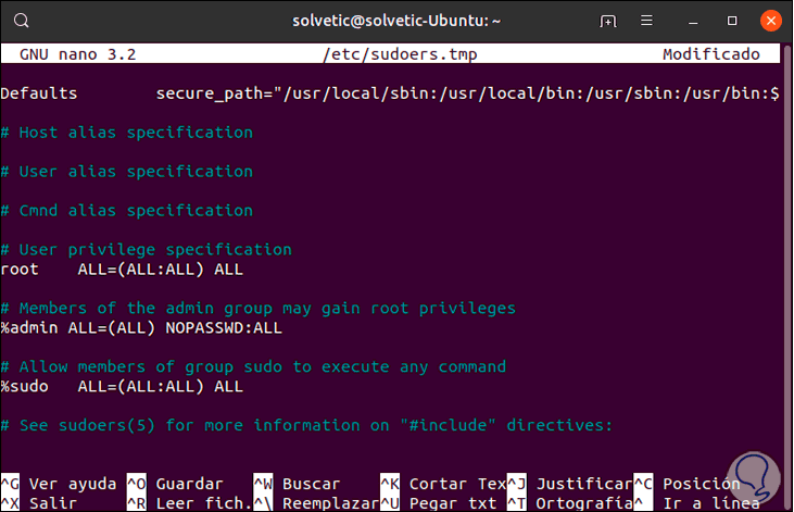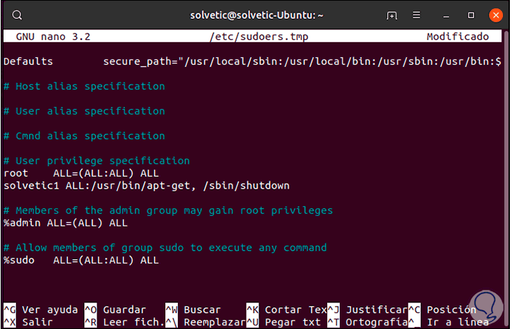 En la misma línea “Allow members of group sudo to execute any comand” vamos a ejecutar, por ejemplo, lo siguiente: