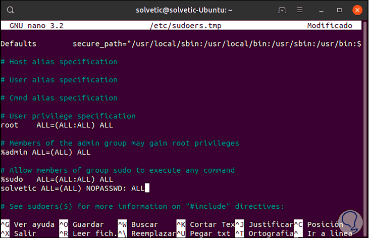 Allí vamos a añadir la línea “NOPASSWD:” antes del último ALL de la siguiente forma: