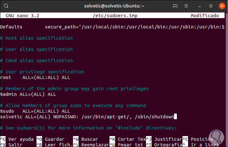 “usuario” ALL=(ALL) NOPASSWD: /usr/bin/apt-get,/sbin/shutdown