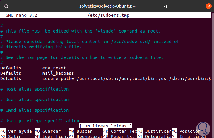 Es posible que en el equipo contemos con diferentes usuarios y por lo tanto deseemos darle permiso a ese usuario de que ejecute un comando sin que requiera el uso de contraseña, para esto, basta con ingresar el usuario y los respectivos comandos en la línea “User privilege especification”:
