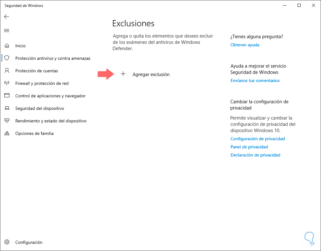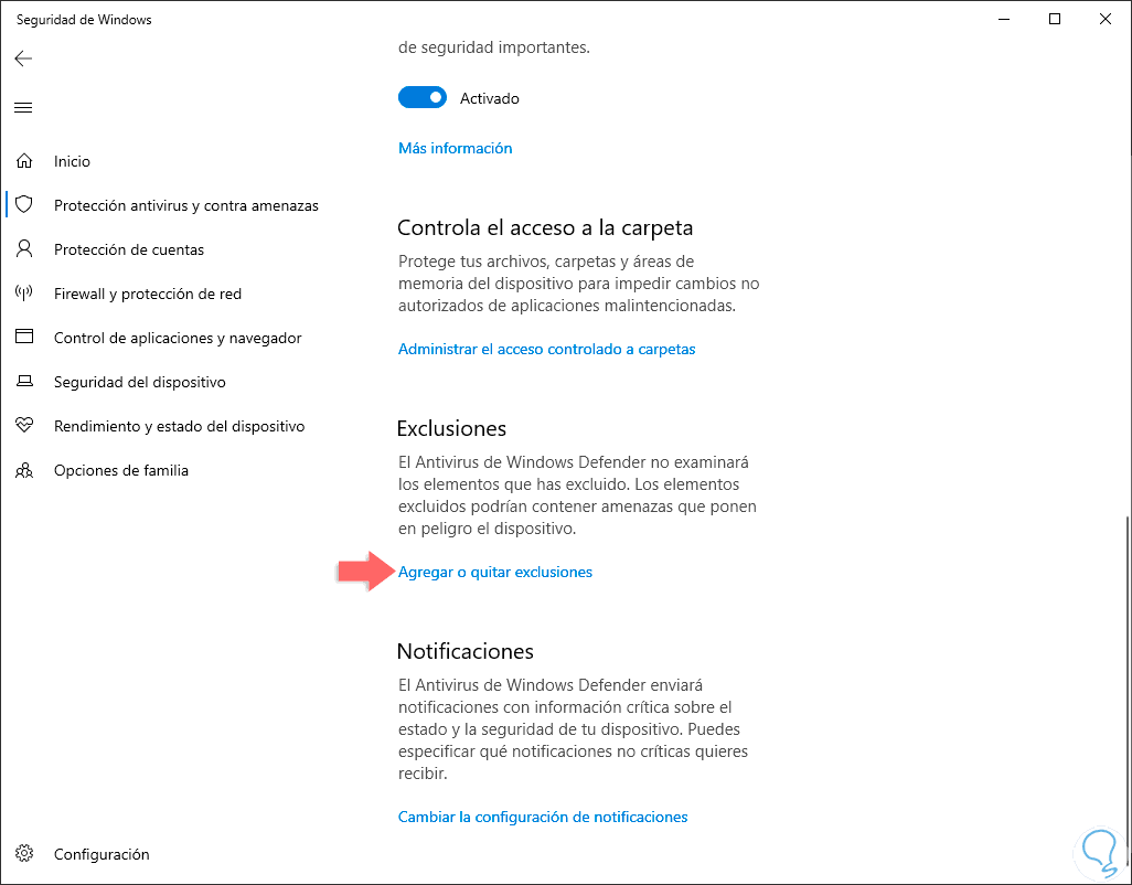 Iremos a la parte inferior y encontramos la sección “Exclusiones”:
