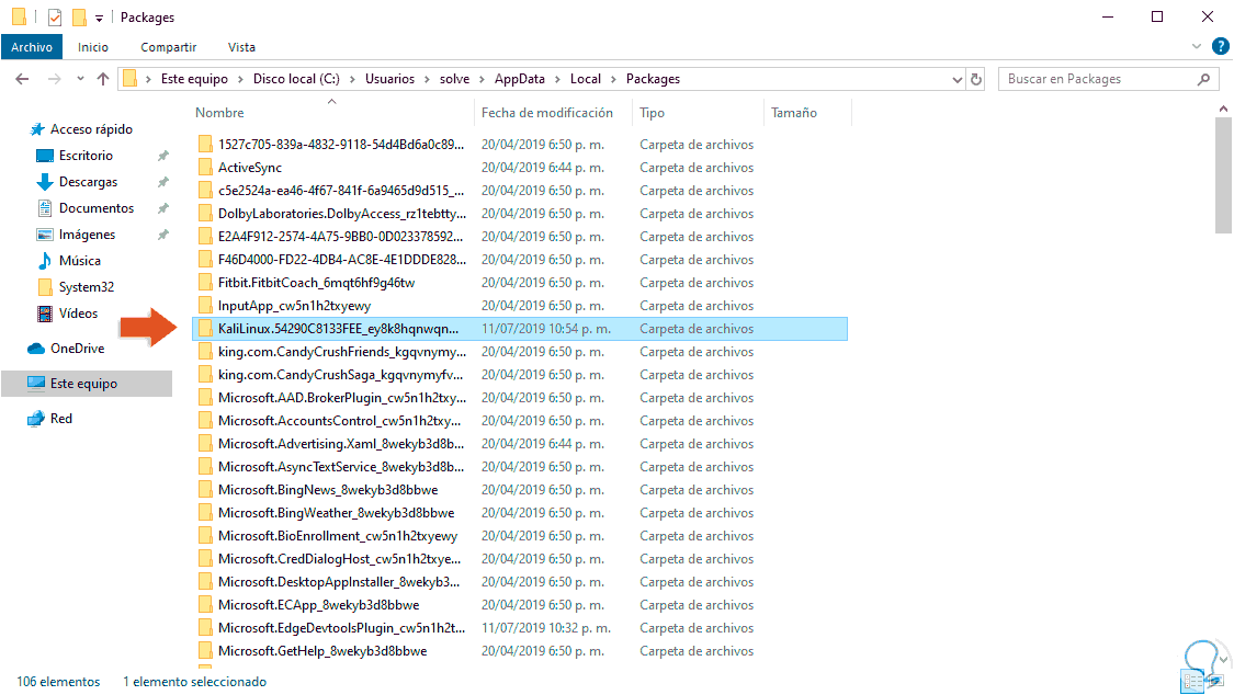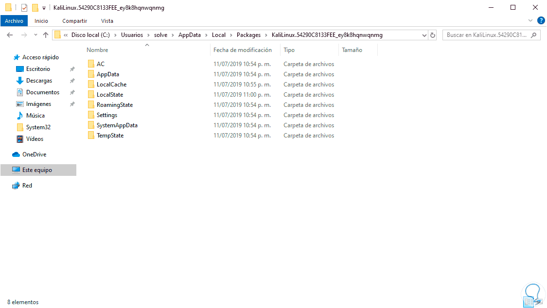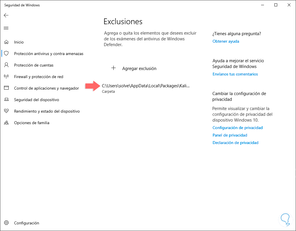 Antes de esto debemos conocer la ruta de la carpeta a excluir, Kali Linux se aloja en la siguiente ruta de Windows 10: