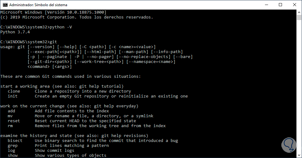 Cuando esto concluya podemos comprobar la versión de Python y Git ejecutando: