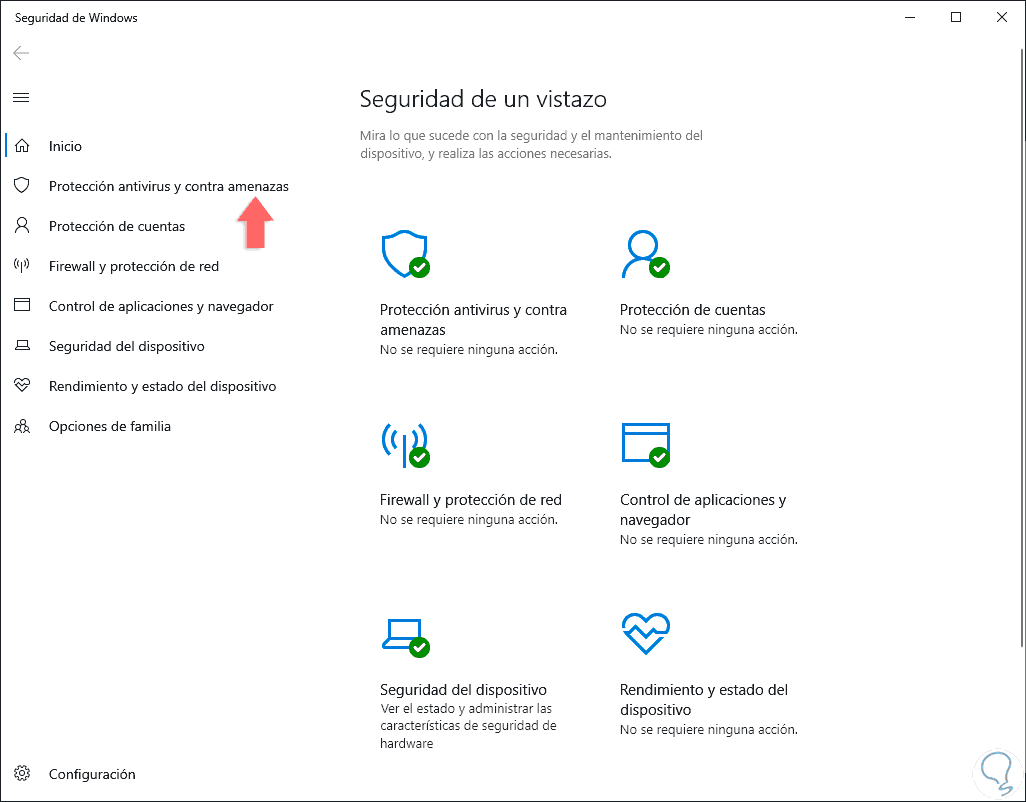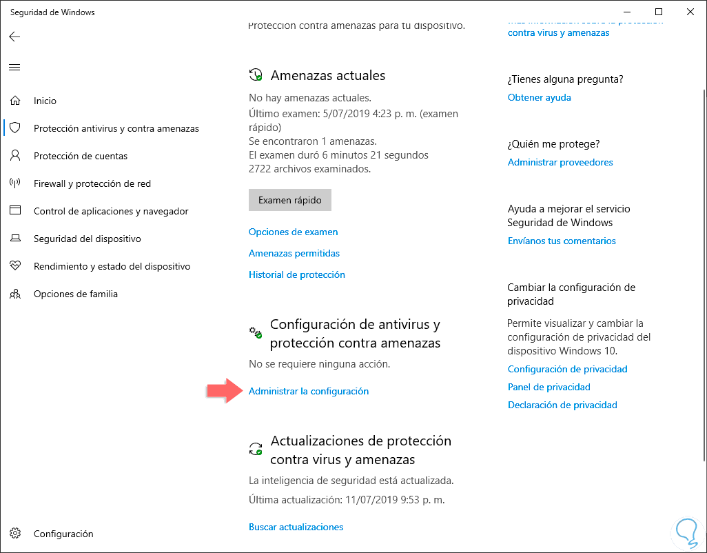 Allí seleccionamos la categoría “Protección antivirus y contra amenazas” y en luego damos clic en la línea “Administrar la configuración”: