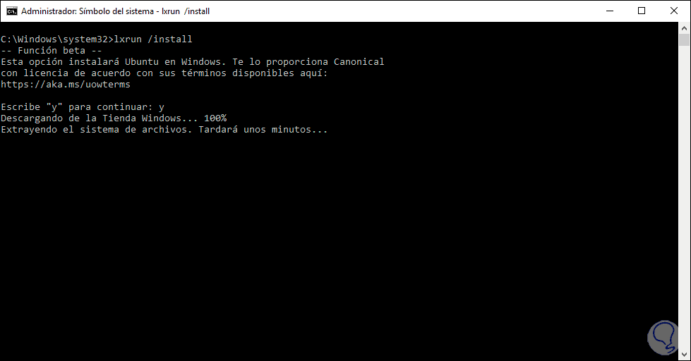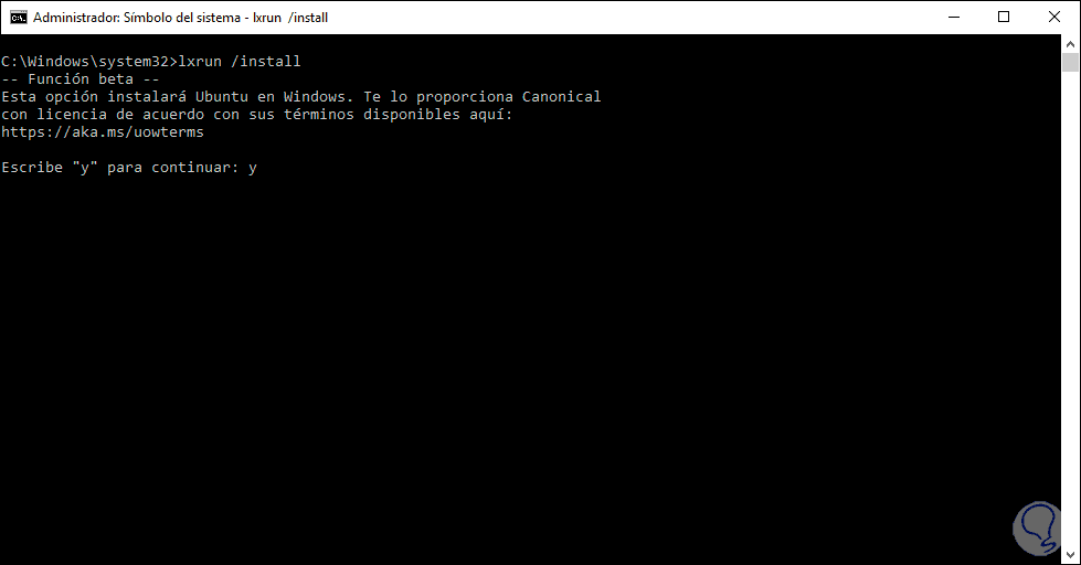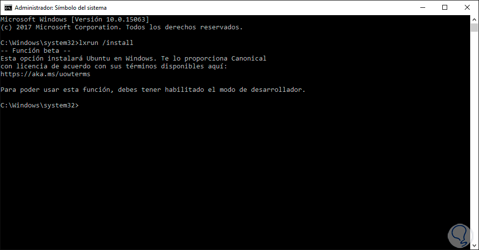 Para este método el primer paso a dar será instalar el sistema Ubuntu por defecto y para ello ejecutamos la siguiente línea en el símbolo del sistema: