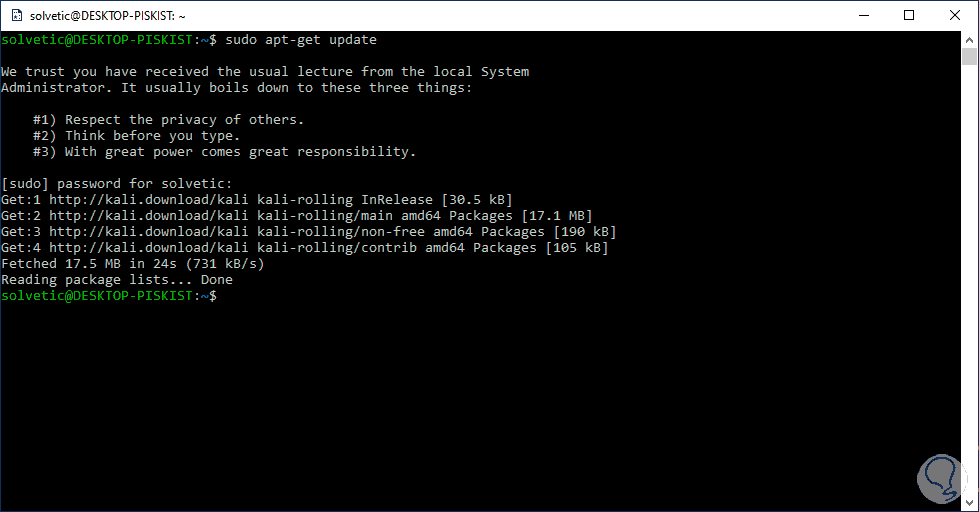 Ahora bien, todo se oye espectacular ¿verdad?, y si Solvetic te dice que puedes usar Kali Linux en tu Windows 10, ¿te animarías a usarloSi piensas que no es posible usar ambos sistemas, pues te equivocas, gracias a las nuevas actualizaciones de Windows 10 hemos recibido una nueva característica llamada Windows Subsystem Linux- Subsistema de Linux para Windows (WSL) la cual permite que como usuarios de Windows 10 podamos hacer uso de la línea de comandos, utilidades y aplicaciones de diversas distribuciones directamente en Windows 10 sin tener que comprar un equipo exclusivo para ello.