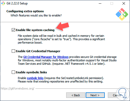 Pulsamos en Next y vamos avanzado hasta la ventana “Configuring extra options” y allí debemos desactivar al casilla “Enable Git Credential Manager”. Pulsamos en Next y continuamos con la instalación de Git en Windows 10.