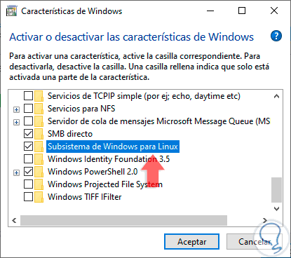 Allí seleccionamos la línea “Activar o desactivar las características de Windows” y en la ventana desplegada activamos la casilla “Subsistema de Windows para Linux”. Damos clic en Aceptar y esperamos que el sistema cargue los archivos respectivos y luego debemos reiniciar el sistema.