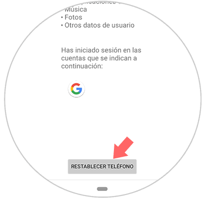 Veremos que el teléfono nos informa de las implicaciones de hacer el reset, como te hemos comentado, ten en cuenta que se borrarán todos los datos almacenados. Si queremos seguir con el proceso, si ya has hecho la copia de seguridad, en la parte inferior de la pantalla debes presionar la opción "Restablecer teléfono"