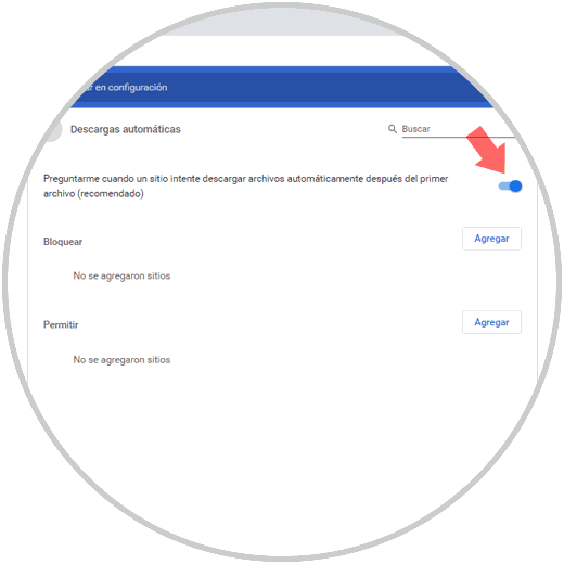 Ahora, como una medida de seguridad mucho mayor, podemos deshabilitar por completo las descargas automáticas pero solo permitir que sitios específicos tengan esa autorización, para ello pulsamos en el interruptor con el fin de deshabilitar las descargas automáticas y luego damos clic en el botón “Agregar” en el campo “Permitir”, allí ingresamos la URL a habilitar: