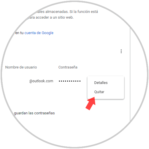 Detalles para ver elementos del sitio como URL, usuario y contraseña. “Quitar” nos permite eliminar la contraseña guardada en Google Chrome y evitar el inicio automático de ese usuario en especial.
