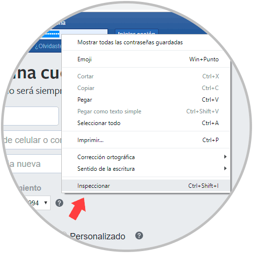 Para este método cerramos la sesión actual de Facebook y en la página de inicio de Facebook seleccionamos todos los asteriscos de la contraseña, damos clic derecho sobre ellos y seleccionamos la opción Inspeccionar o bien podemos usar las teclas siguientes: