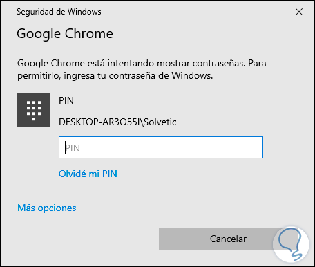 Como podemos ver, allí vemos el sitio (Facebook.com), el usuario que ha guardado la contraseña y la contraseña protegida, para visualizarla, damos clic en el icono de ojo (Mostrar contraseña) y se desplegará una ventana emergente donde debemos ingresar el método de autenticación del sistema (contraseña o PIN):