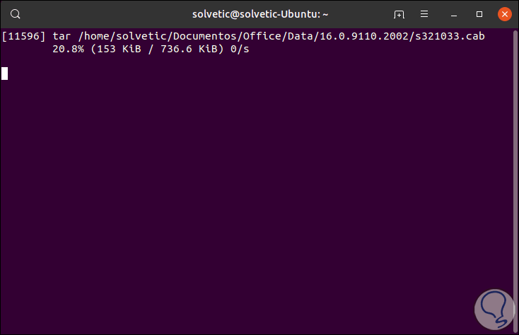 tar -czf - ./Documentos/ | (pv -p --timer --rate --bytes > solvetic.tgz)Al dar Enter veremos el estado de la orden junto a la barra de progreso y las medidas respectivas: