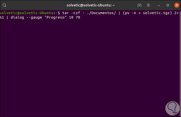 tar -czf - ./Documentos/ | (pv -n > solvetic.tgz) 2>&1 | dialog --gauge "Progreso" 10 70