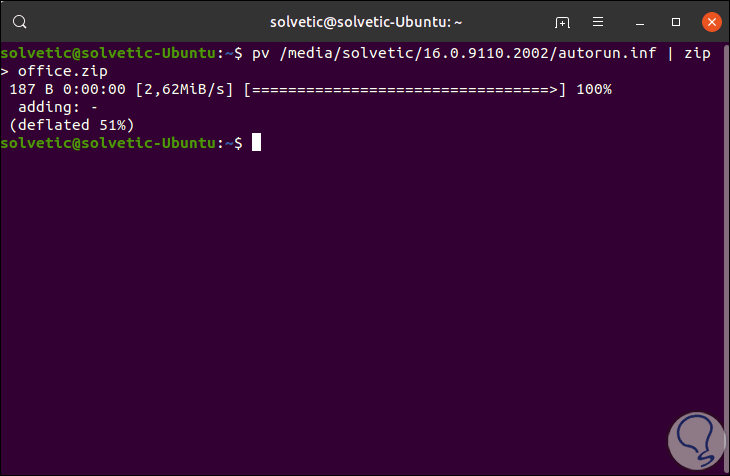 Si deseamos acceder a algún archivo para su compresión, debemos ejecutar pv seguido de la ruta y añadir | zip > nombre.zip: