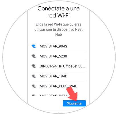 El siguiente paso es vincular tu Nest Hub a una red WiFi para que funcione correctamente. Seleccionála en el listado y pulsa en “Siguiente”.