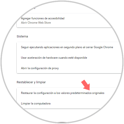 Ahora, en la siguiente ventana iremos a la sección “Restablecer y limpiar” y allí damos clic sobre “Restaurar la configuración a los valores predeterminados originales”: