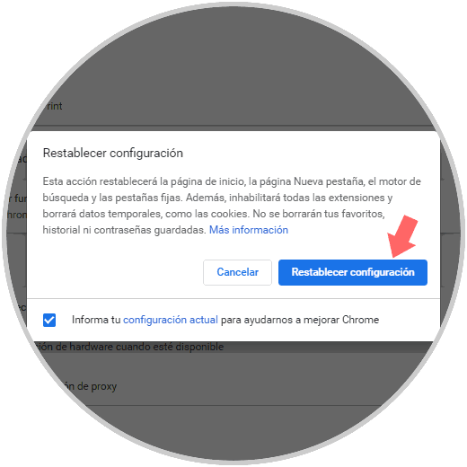 Se desplegará el siguiente mensaje. Confirmamos la acción dando clic en Restablecer configuración.