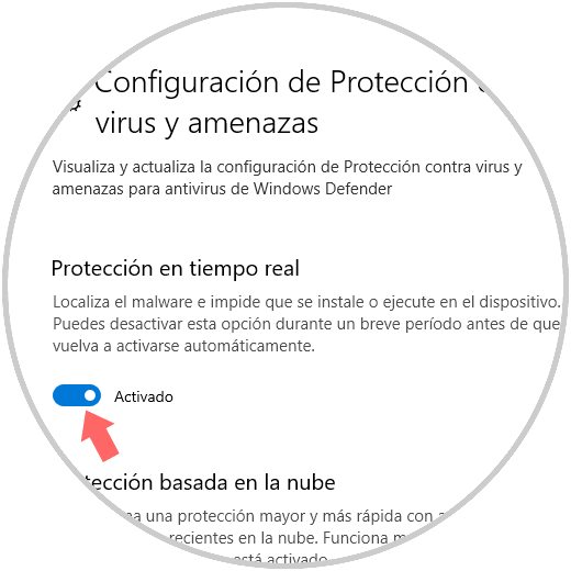 Allí damos clic en la línea “Administrar la configuración” y veremos lo siguiente. Para deshabilitar de forma temporal el antivirus damos clic en el interruptor “Activado” ubicado en la sección “protección en tiempo real”.