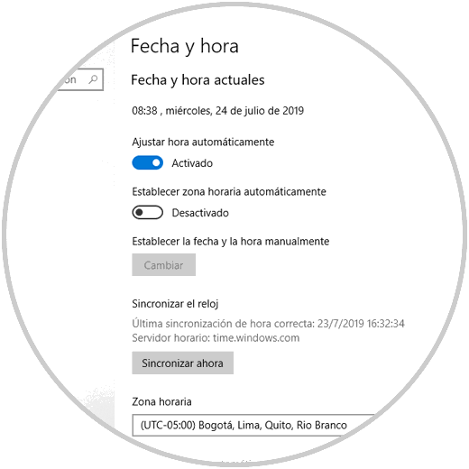 Confirmamos que el valor “Ajustar hora automáticamente” se encuentre activo y pulsamos en el botón “Sincronizar ahora” para que se actualice dicha información.