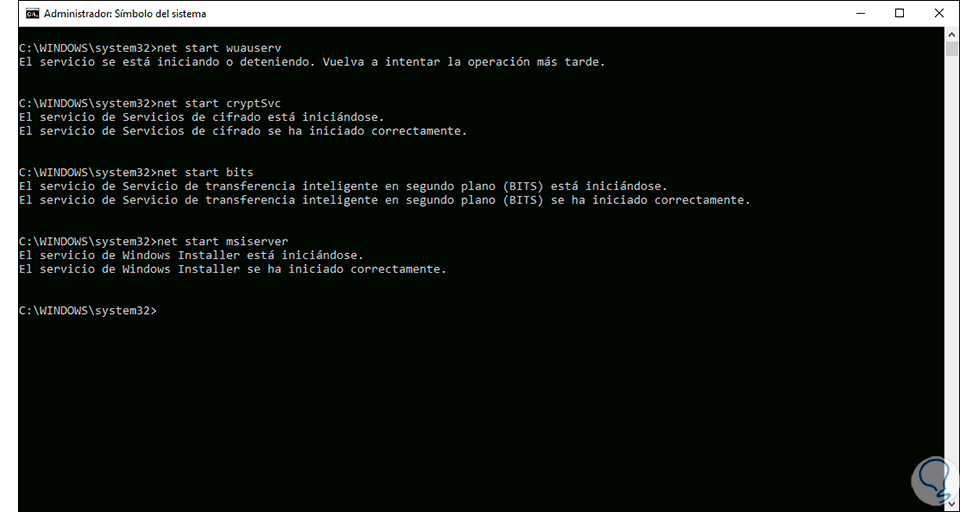 net start wuauserv net start cryptSvc net start wuauserv net start bits net start msiserver