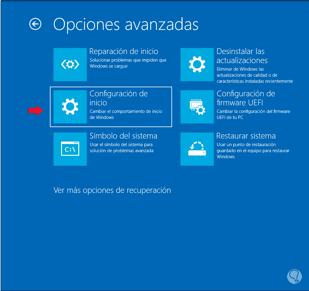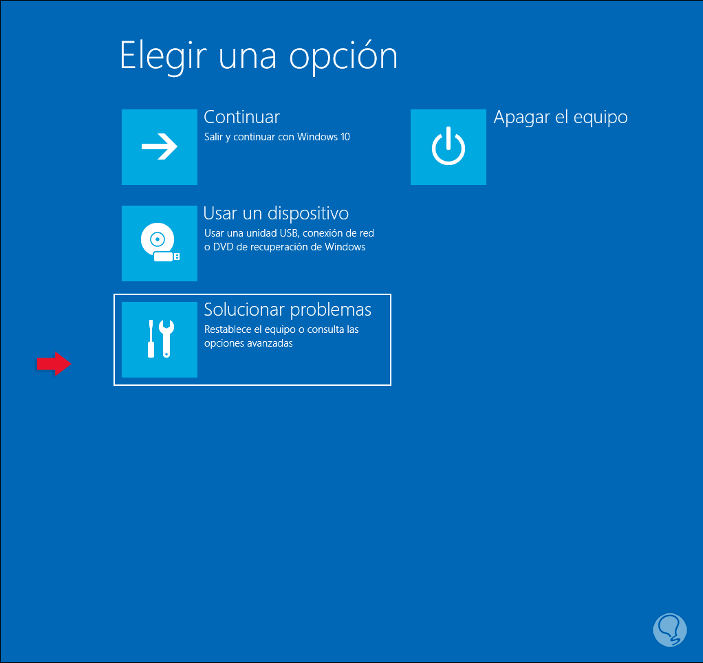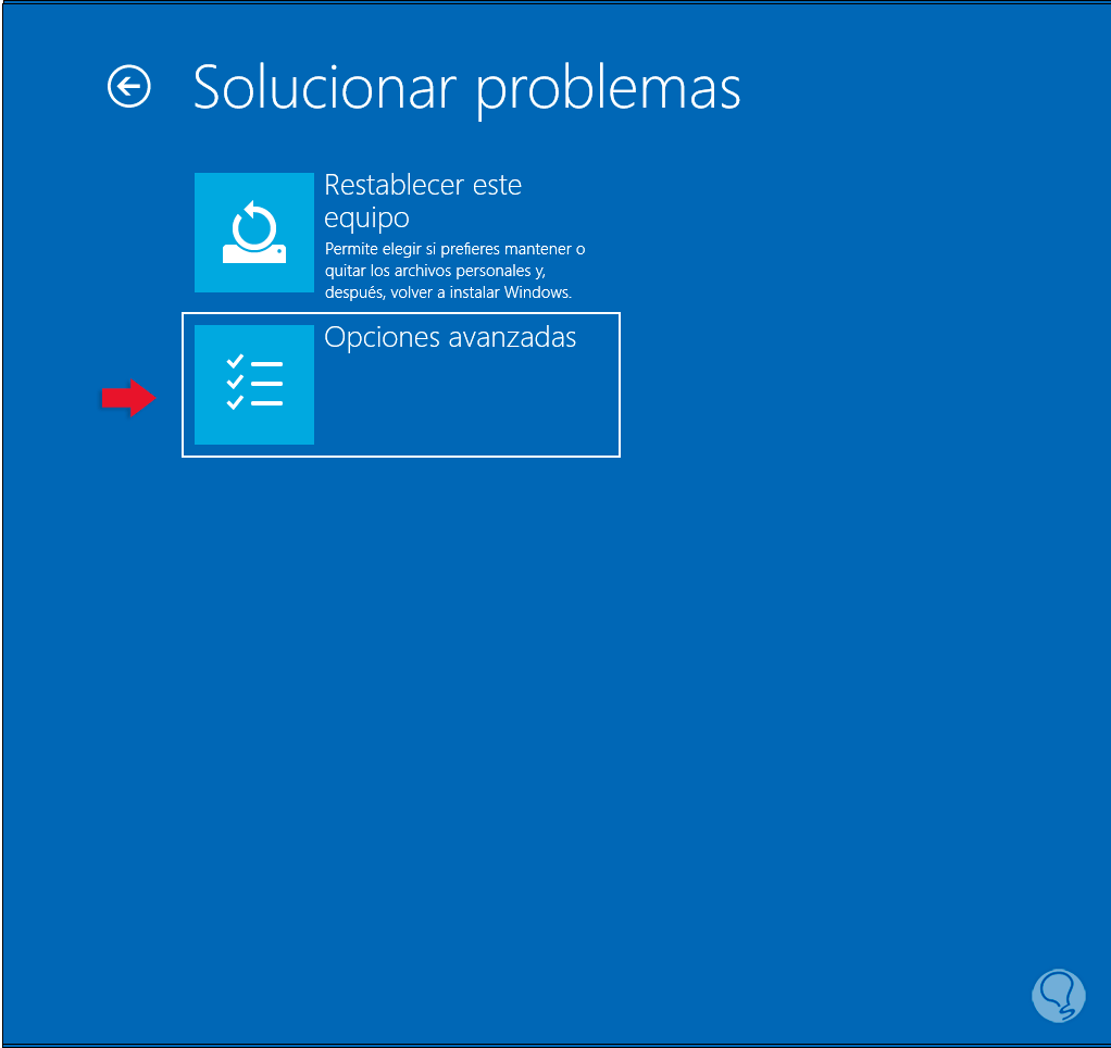 Allí seleccionamos la opción “Solucionar problemas” y en la siguiente ventana seleccionamos la línea “Opciones avanzadas”: