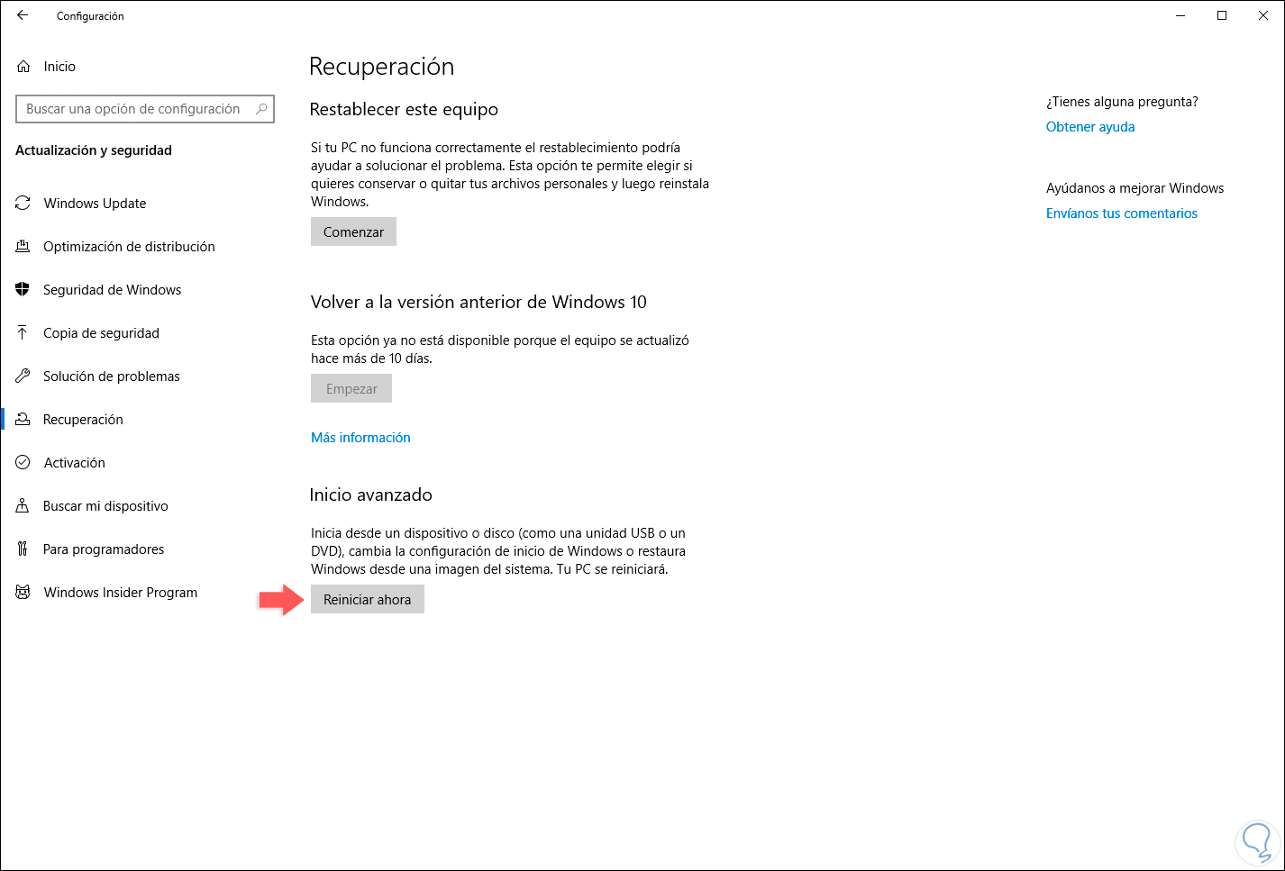 Allí damos clic en Reiniciar y veremos las siguientes opciones: