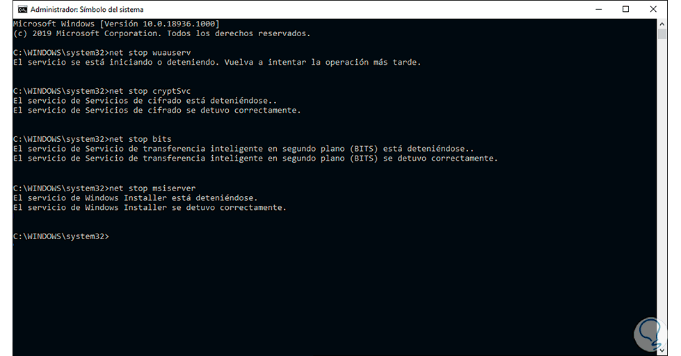 net stop wuauserv (detendrá el servicio de Windows Update) net stop cryptSvc (detendrá el servicio de criptografia) net stop bits (detendrá el servicio de BITS) net stop msiserver (detendrá el servicio de msiserver el cual añade, modifica o elimina aplicaciones que son entregadas como un paquete de Windows Installer (* .msi))