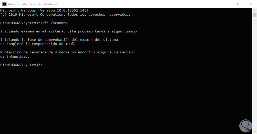 Posterior a esta tarea, otro de los comandos útiles de Windows 10 es SFC (System File Checker) el cual analiza y corrige los errores en el sistema de archivos del disco, para esto, en la consola del símbolo del sistema, ejecutamos: