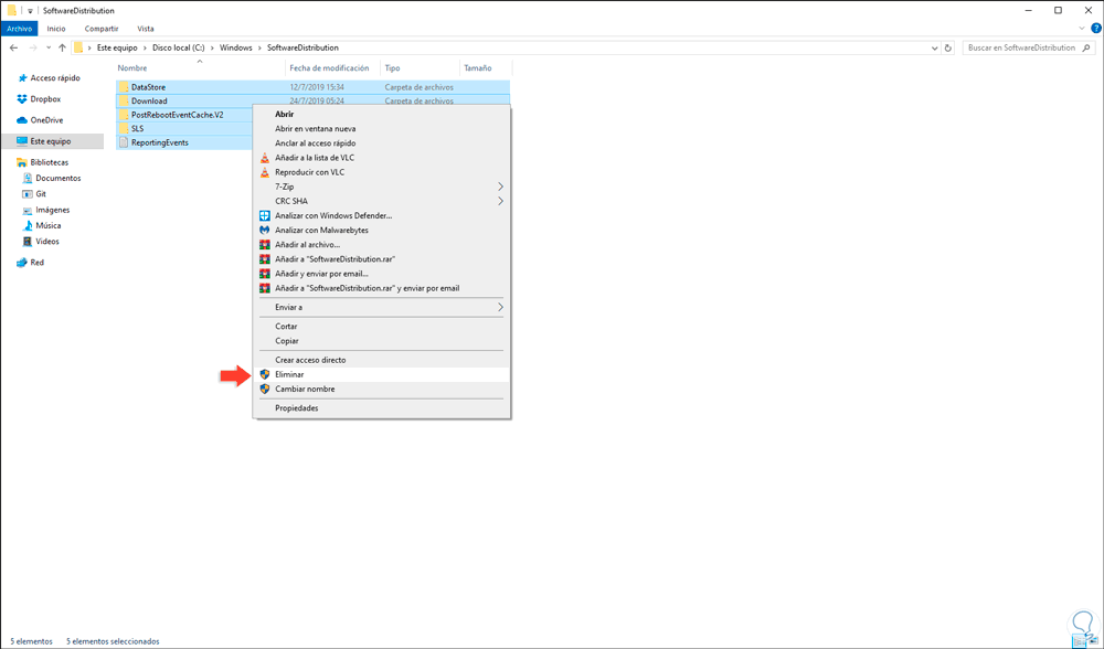 Allí seleccionamos todo el contenido y lo borramos. Después de esto vamos a reiniciar el sistema operativo y ejecutamos Windows Update para completar las acciones.