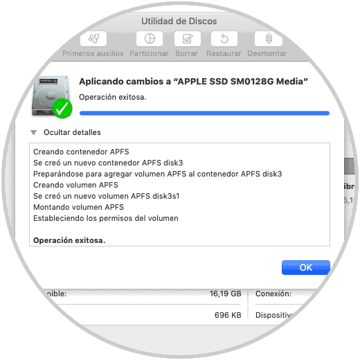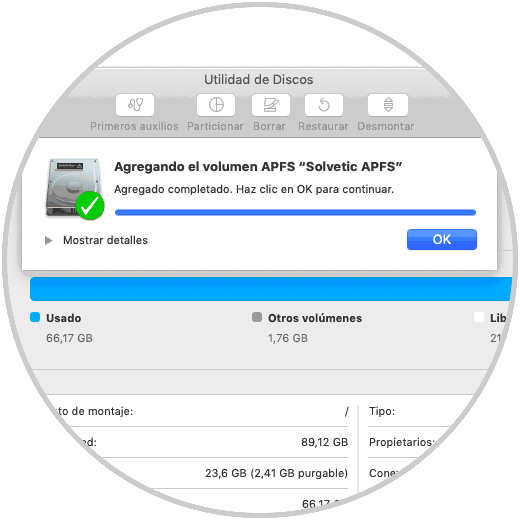Pulsamos en OK para salir del asistente y ahora este nuevo volumen APFS estará disponible en la utilidad de discos del sistema: