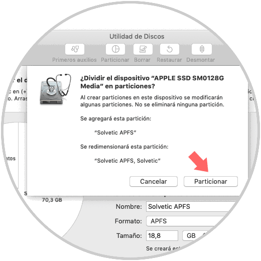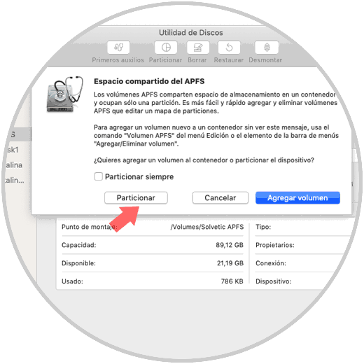 Al momento de pulsarla veremos lo siguiente. Allí se recomienda crear un volumen por el manejo que APFS hace de los espacios pero igual vamos a crear nuestra partición, damos clic en el botón “Particionar”