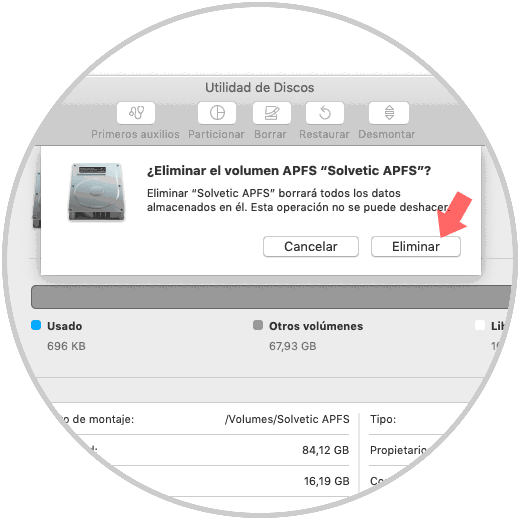 Al confirmar se dará lugar al proceso de eliminación del volumen APFS seleccionado: