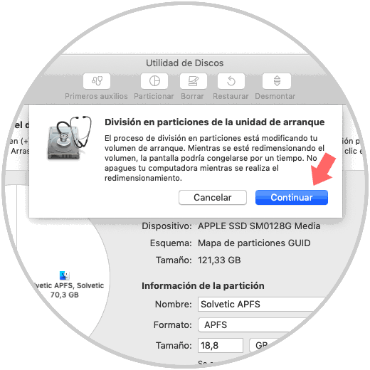 Esto se debe a que la partición influye en el arranque del disco, confirmamos dando clic en Continuar y macOS se encargará de crear la partición en base a los requerimientos que hemos definido: