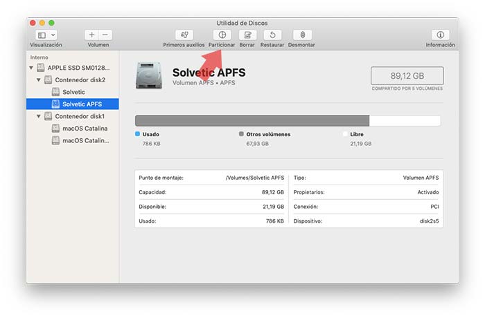 Para crear una partición APFS, en primer lugar seleccionamos el volumen en el cual se creará dicha partición. En la parte superior encontramos la opción “Particionar”