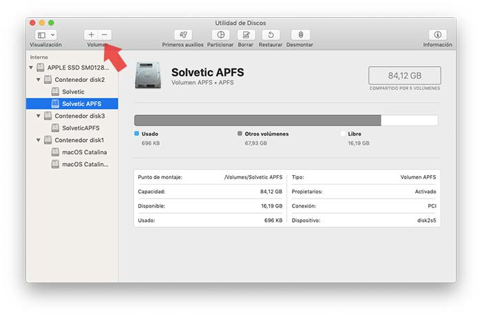 Para crear nuestro contenedor, seleccionamos el disco duro en la Utilidad de discos y pulsamos en el signo + ubicado en la línea “Volumen” en la parte superior de la utilidad: