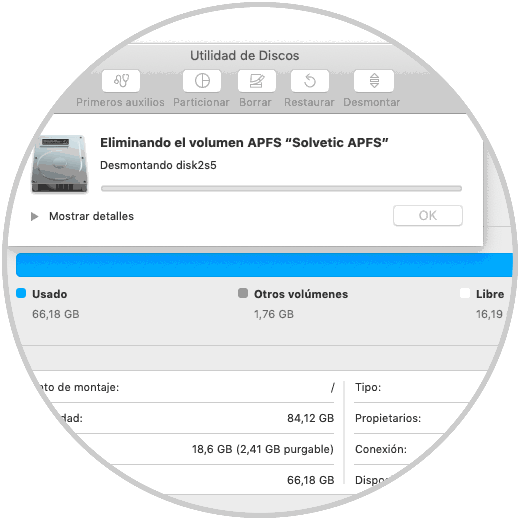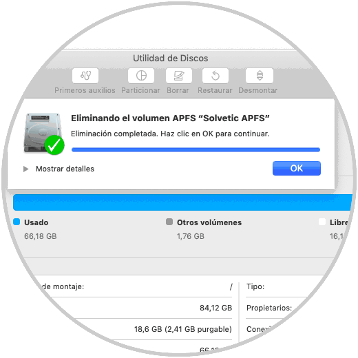 Pulsamos en Ok y así hemos eliminado el volumen APFS en macOS.