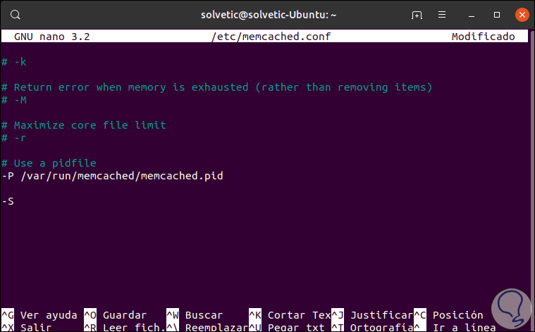 Si el valor establecido es -l 127.0.0.1 no vamos a realizar ningún cambio y si por razones de acceso debemos permitir conexiones externas un consejo que te da Solvetic es deshabilitar UDP el cual se presta para los ataques de denegación de servicio, para realizar esta deshabilitacion simplemente añadimos la siguiente línea al final del archivo de configuración de Memcached: