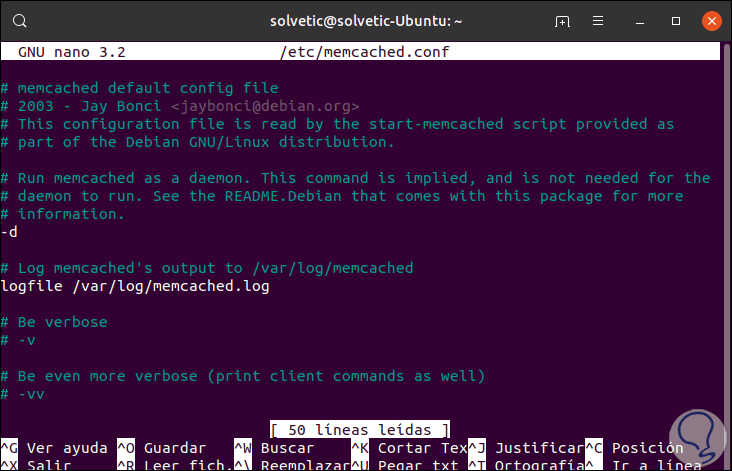 Ahora vamos a descomentar la línea -vv la cual entrega detalles al archivo /var/log/memcached: