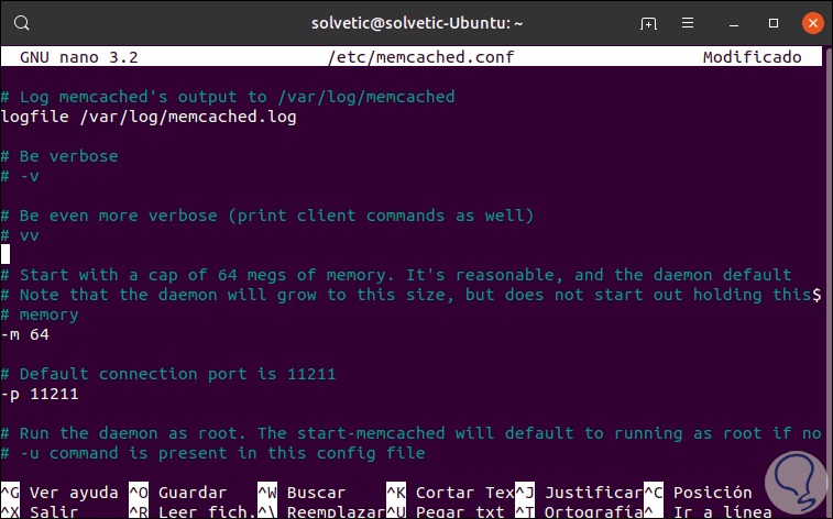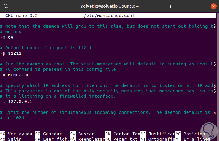 sudo nano /etc/memcached.confAllí al final añadiremos lo siguiente: